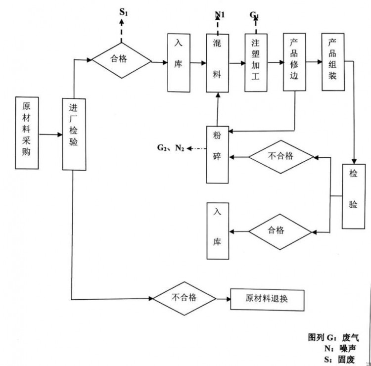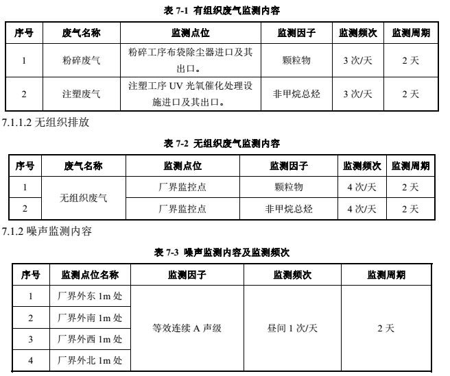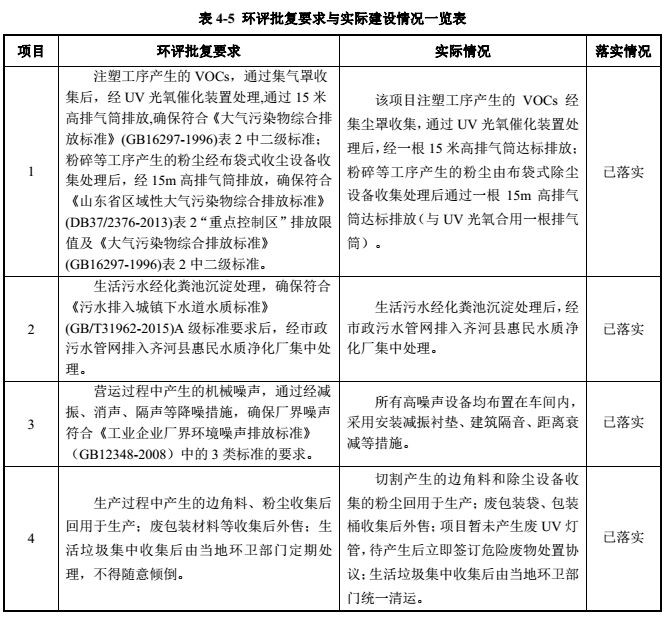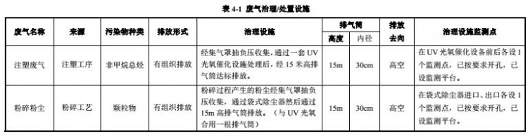 (1)注塑工序产生的 VOCs,通过集气罩收集后,经 UV光氧催化装置处理,通过  15米高排气筒排放,确保符合《大气污染物综合排放标准》(GB16297-1996)表 2中二级标准;粉碎等工序产生的粉尘经布袋式收尘设备收集处理后,经 15m高排气筒排放,确保符合《山东省区域性大气污染物综合排放标准》(DB37/2376-2013)表 2“重点控制区”排放限值及《大气污染物综合排放标准》(GB16297-1996)表 2中二级标准。