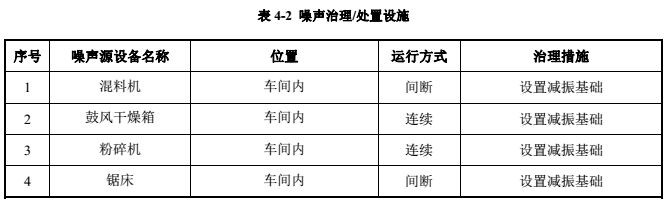 本项目主要噪声源为混料机、鼓风干燥机、粉碎机以及锯床等设备运行过程产生的噪声,噪声级为 85~95dB(A)。所有高噪声设备均布置在车间内,采用安装减振衬垫、建筑隔音、距离衰减使厂界噪声达标排放。经采取以上措施后,经预测,厂界噪声和敏感点噪声均能够达到《工业企业厂界环境噪声排放标准》(GB12348—2008)表  1 中 3类标准的要求,对周围声环境影响不大。