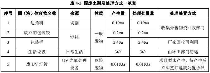 本项目聚乙烯板和绿巨人网站在线观看板边角料、原料使用后废弃的包装袋属一般工业固体废物,收集暂存后外售综合利用;包装桶收集后厂家回收再利用,生活垃圾集中收集后由环卫部门集中处置,废 UV灯管产生周期较长,项目暂未产生,待产生后立即签订危废协议。