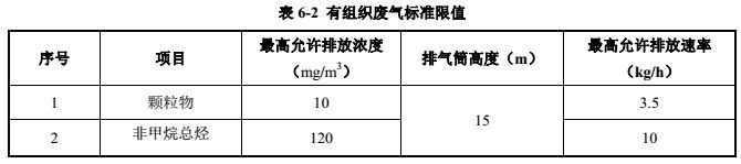 本项目产生的主要废气为非甲烷总烃及粉尘。非甲烷总烃经集气罩抽负压收集后进入UV光催化氧化处理然后通过  15米高排气筒排放,非甲烷总烃能够满足《大气污染物综合排放标准》(GB 16297-1996)表 2中有组织排放二级标准中最高允许排放速率限值(排气筒高度15m,10kg/h)最高排放浓度(120mg/m3)。
