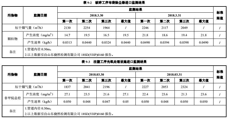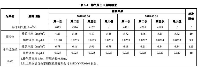 由表 9-2~9-4得出,验收监测期间,废气处理装置排气筒出口两天内所测颗粒物、非甲烷总烃排放浓度最大值分别为5.72mg/m3、6.78mg/m3,小于标准限值 10mg/m3、120 mg/m3,最大排放速率分别为 0.0253kg/h、0.027kg/h,小于其标准排放速率限值 3.5kg/h、10kg/h。破碎工序经布袋除尘器、注塑工序经 UV光催化氧化装置处理后,颗粒物的排放浓度符合《山东省区域性大气污染物综合排放标准》(DB37/2376-2013)表 2重点控制区标准要求,其排放速率符合《大气污染物综合排放标准》(GB  16297-1996)表 2中二级标准要求。非甲烷总烃的排放浓度及排放速率符合《大气污染物综合排放标准》(GB 16297-1996)表 2中二级排放标准要求。