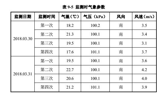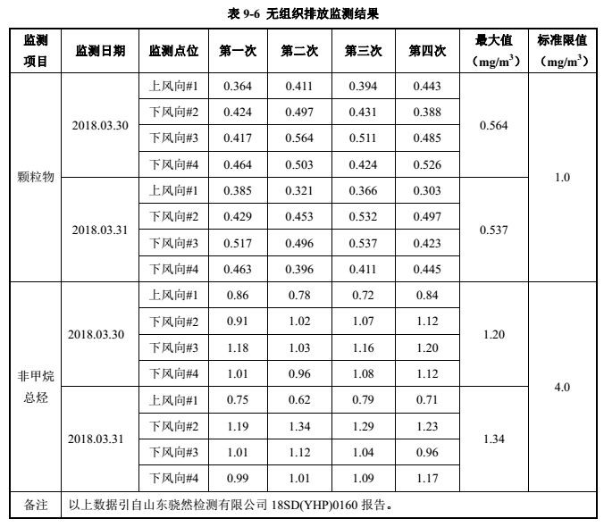 由表  9-6  得出,验收监测期间,无组织废气排放的颗粒物和非甲烷总烃最大排放浓度为0.564mg/m3和  1.34mg/m3,小于其标准排放浓度限值 1.0mg/m3和 4.0mg/m3,满足《大气污染物综合排放标准》(GB 16297-1996)表 2中无组织排放的标准限值要求。