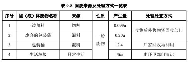 本项目生产过程中产生的固体废物主要为聚乙烯板和绿巨人网站在线观看板边角料、原料使用后废弃的包装袋、包装桶以及员工产生的生活垃圾等。本项目切割的聚乙烯板和绿巨人网站在线观看板边角料回收后出售;废弃的包装袋外售;包装桶由厂家回收再利用;生活垃圾由当地环卫部门统一清运。